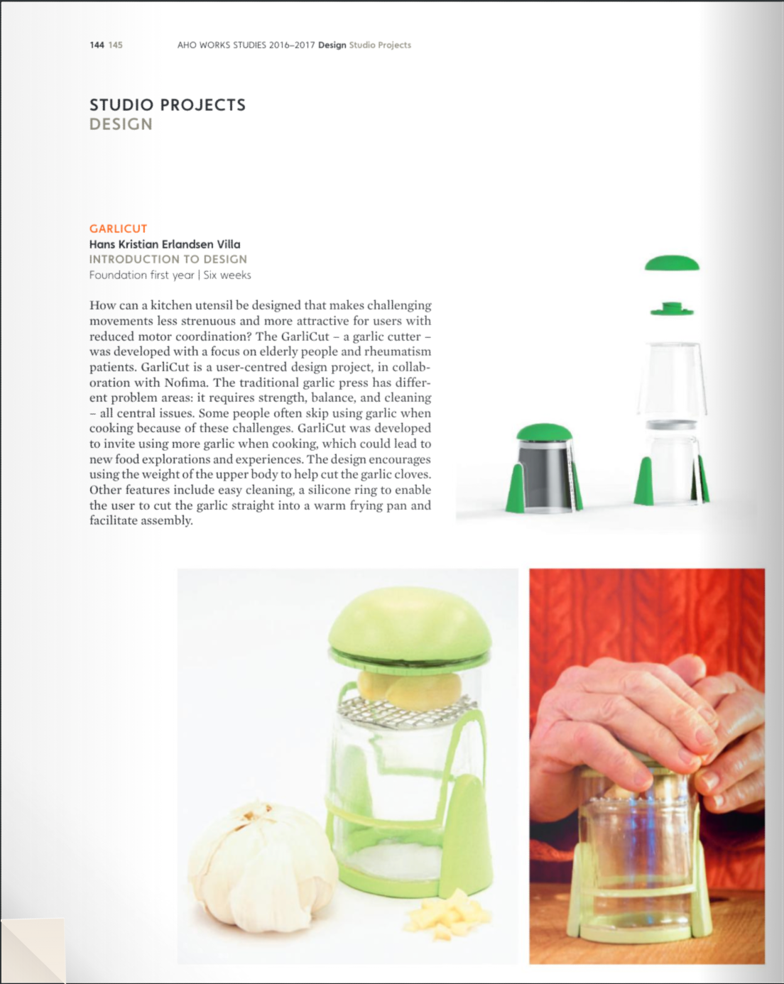 GarliCut is a user centered design project in collaboration with Nofima, one of the largest institutes for applied food research in Europe. The project revolves about eating/kitchen utensils and elder people.